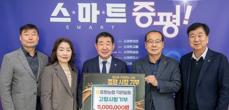 [충북일보] 배종록(오른쪽 두 번째) 증평농협조합장이 12일 지역발전을 위한 고향사랑기부금 1천100만 원을 이재영(가운데) 군수에게 전달하고 있다.