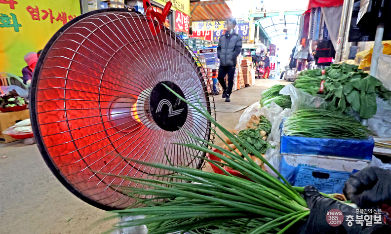 휴일인 18일 청주의 한 전통시장에서 상인이 전기난로에 손을 녹이며 파를 다듬고 있다. 청주기상청은 이번 주 충북 대부분 지역에 강한 한파가 찾아올 것으로 예보했다.