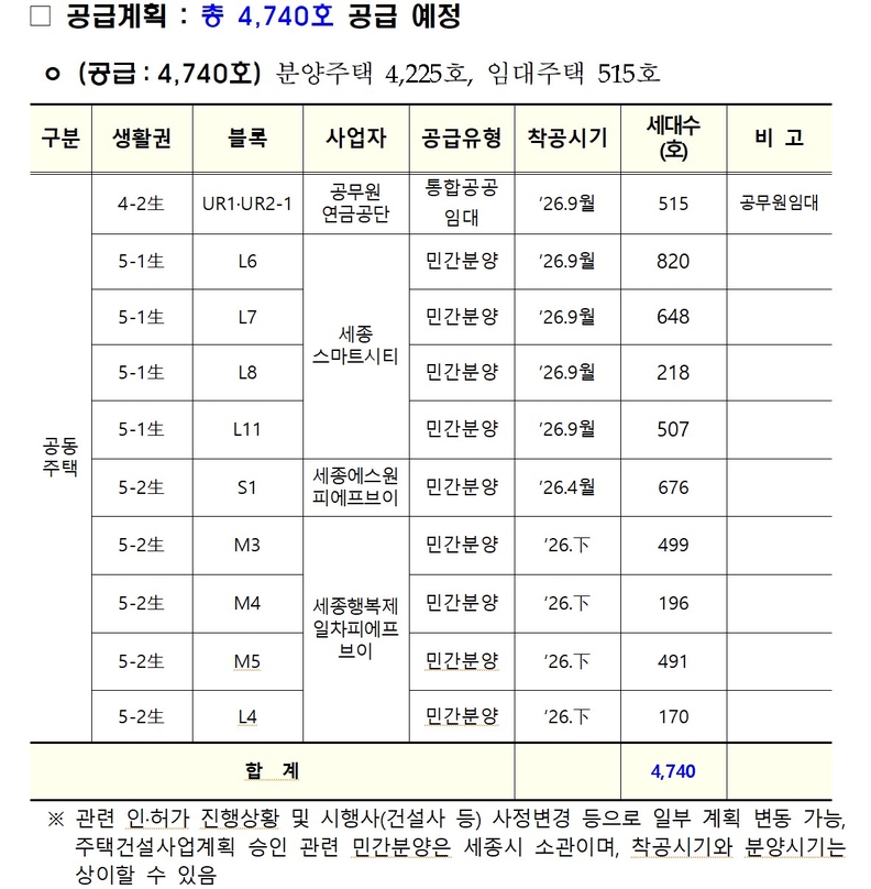 공급물량은 집현동(4-2생활권), 합강동(5-1생활권), 다솜동(5-2생활권) 3개 생활권에 총 4천740호로, 공급물량 중 분양주택 4천225호, 임대주택 515호이다.