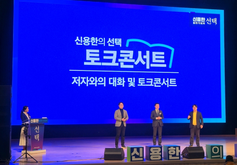 신용한(오른쪽 두 번째) 대통령 직속 지방시대위원회 부위원장의 저서 '선택' 출판기념회가 8일 충북대학교 개신문화관에서 열린 가운데 2부 행사인 토크콘서트가 열리고 있다.