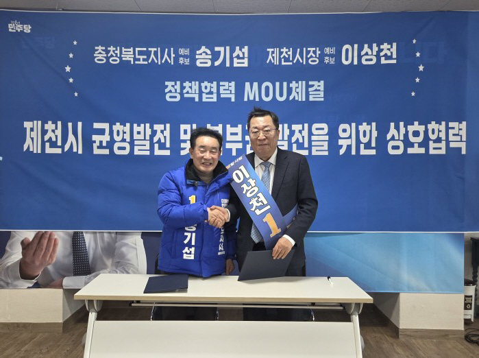 먼저 송기섭 충북도지사 예비후보는 23일 이상천 제천시장 예비후보와 '제천시 균형발전 및 북부권 도약'을 위한 정책 협력 양해각서(MOU)를 체결했다.