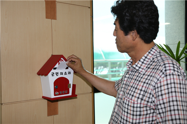 영동의 한 민원인이 군청 민원실에 설치한 건의함을 이용하고 있다.