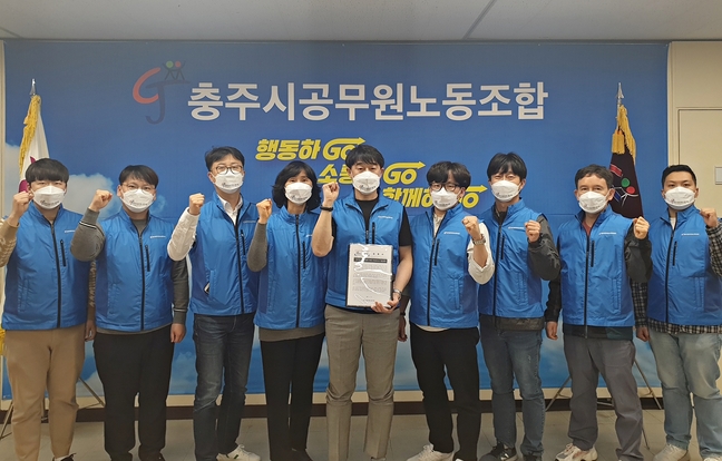 충주시공무원노조원들이 공무원 폭행 사건과 관련해 무관용으로 대응할 것으로 선언하고 있다.