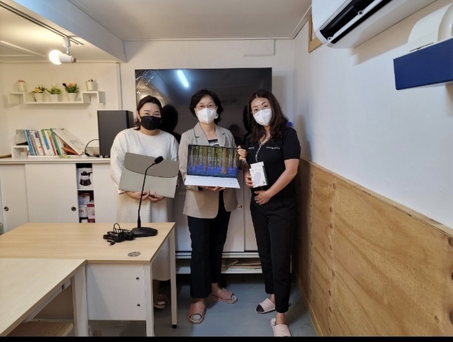 아모레퍼시픽복지재단 관계자가 제천여자단기청소년쉼터를 찾아 온라인 교육기기를 전달하고 있다.