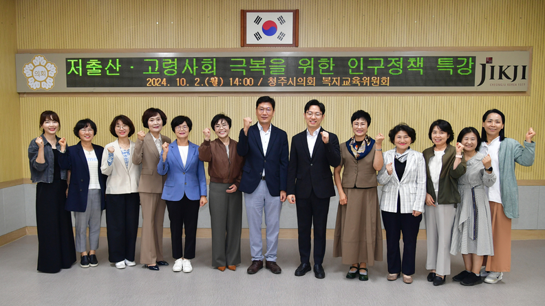 청주시의회 복지교육위위원회가 시의원과 직원 등을 대상으로 ‘저출산·고령사회 극복을 위한 인구정책 특강’을 진행하고 기념촬영을 하고 있다.