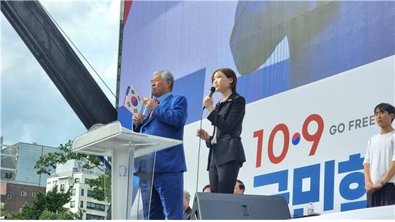 전광훈 국민혁명의장이 9일 오후 서울 광화문 이순신 동상 앞에서 발언을 하고 있다.