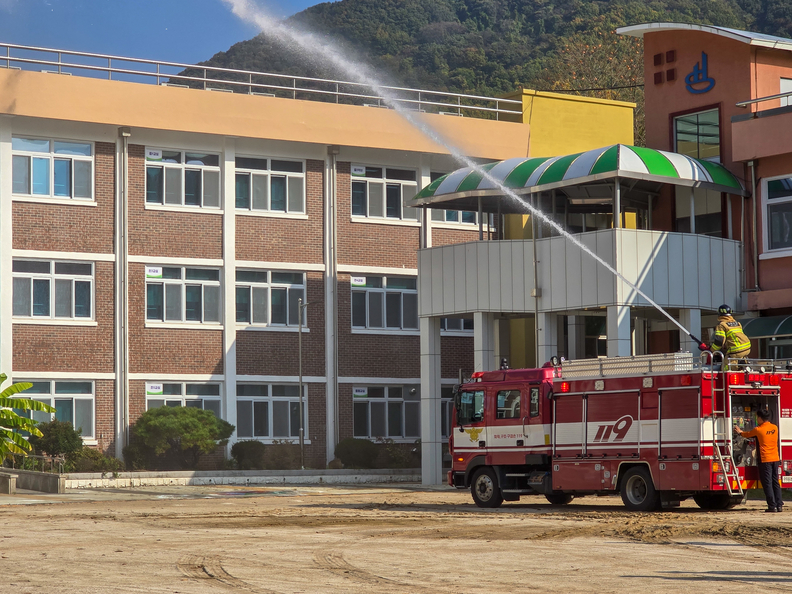 제천 한송초병설유치원에서 합동소방훈련이 실시되고 있다.