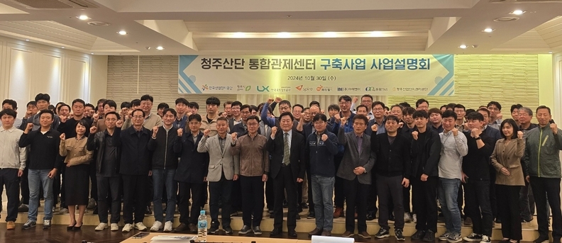 지난 30일 청주산단 통합관제센터 구축사업 입주기업 설명회 참석자들이 기념촬영하고 있다.