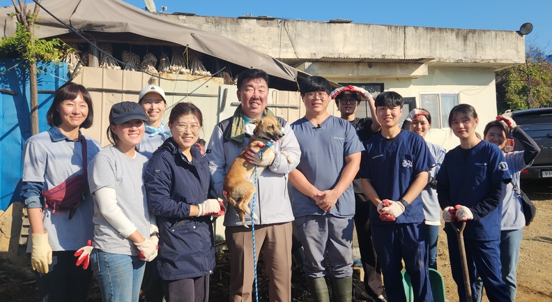 이범석 청주시장이 3일 시골동물 의료봉사에 동참해 기념촬영을 하고 있다.