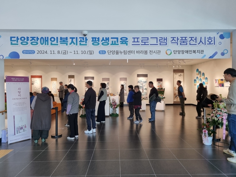 단양장애인복지관이 올누림센터에서 연 '평생교육 프로그램 작품전시회'에 많은 관람객이 찾아 작품을 감상하고 있다.
