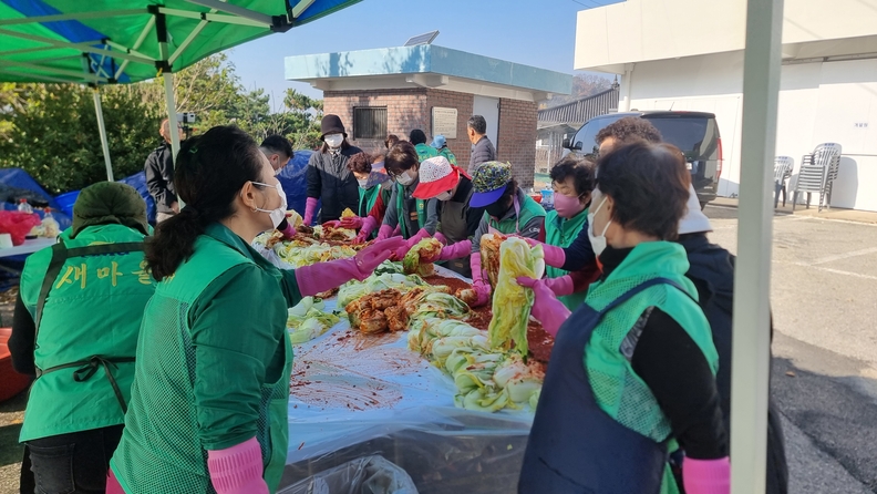 동량면 새마을협의회 회원들이 취약계층을 위한 김장김치를 담그고 있다.