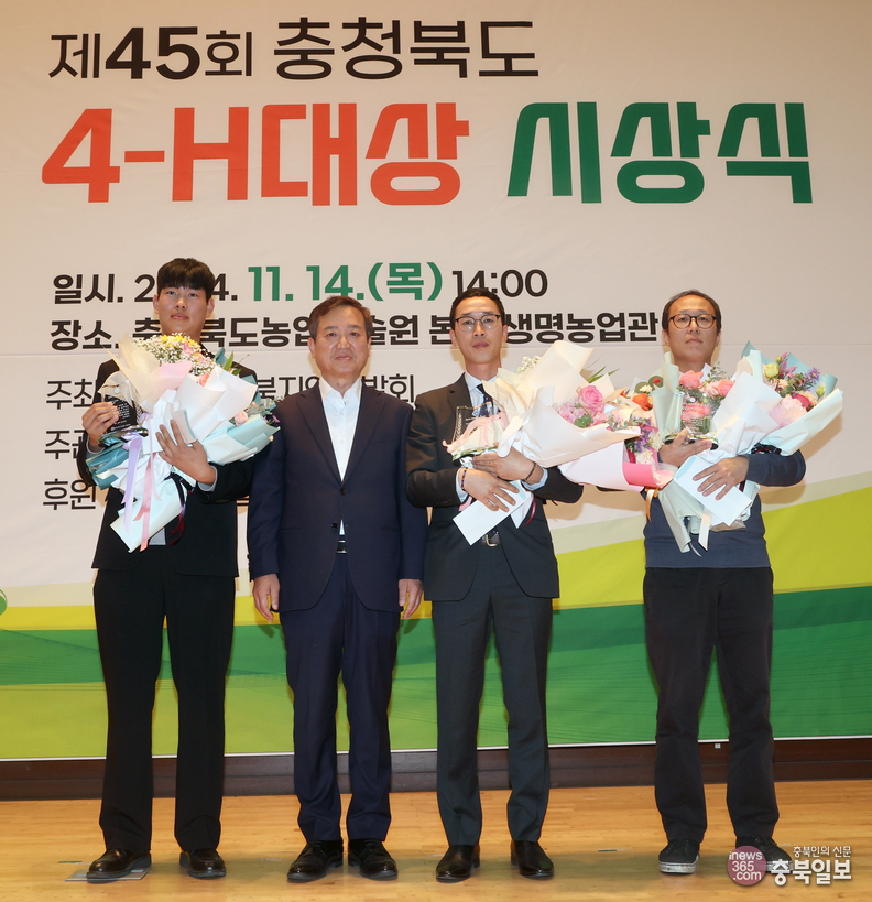 14일 충북도농업기술원에서 열린 45회 충청북도4-H대상 시상식에서 연경환 본보 대표와 수상자들이 기념촬영을 하고 있다.
