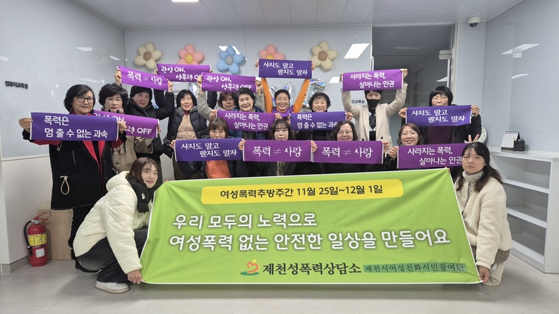 제천성폭력상담소가 추진한 '우리의 관심으로 함께 만드는 안전한 일상'을 주제로 한 기념행사 및 릴레이 캠페인 참석자들이 기념촬영을 하고 있다.