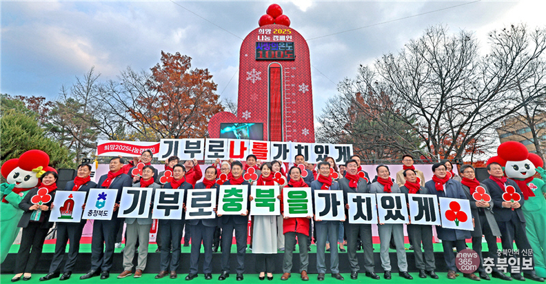 희망2025나눔캠페인 출범식이 충북사회복지공동모금회 주관으로 2일 청주 상당공원에서 열렸다. 이날 출범식에서 김수민 정무부지사를 비롯한 주요 참석자들이 사랑의 온도탑 100도 시연식을 갖고 있다.