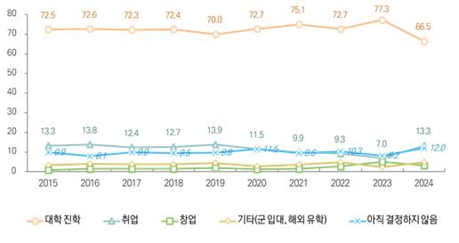 고등학생의 졸업 후 진로계획에 대해 조사한 결과 지난해와 비교해 대학 진학 응답 비율(77.3→66.5%)은 감소하고 취업 응답 비율(7.0→13.3%)은 상승했다. 지난 2015년 이후 대학 진학 응답 비율이 70%대 밑으로 내려온 것은 올해가 처음이다.