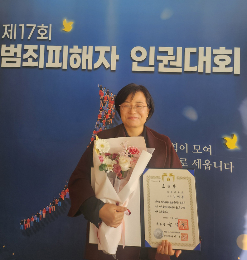 김태경 서원대학교 상담심리학과 교수가 범죄피해자 보호·지원에 기여한 공로를 인정받아 최근 열린 17회 범죄피해자 인권대회에서 대통령 표창을 받고 있다.
