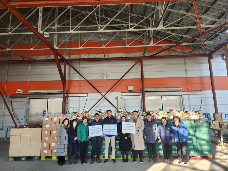 충주지역 기업 영신내추럴과 청년농부들, 금성농산 관계자들이 충주시노인복지관 등에 후원할 김장 김치 앞에서 기념사진을 찍고 있다.