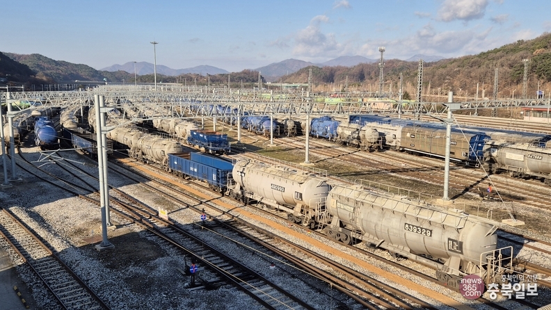 코레일 충북본부 제천 조차장관리역에 멈춰 서 있는 화물열차.