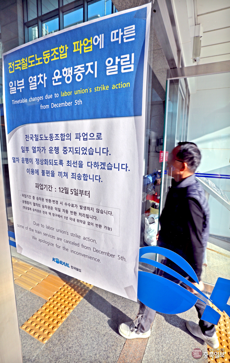 전국철도노동조합이 5일부터 파업에 돌입하면서 청주시 청원구 오근장역 입구에 일부 열차 운행 중지에 따른 파업 안내문이 게시돼 있다.