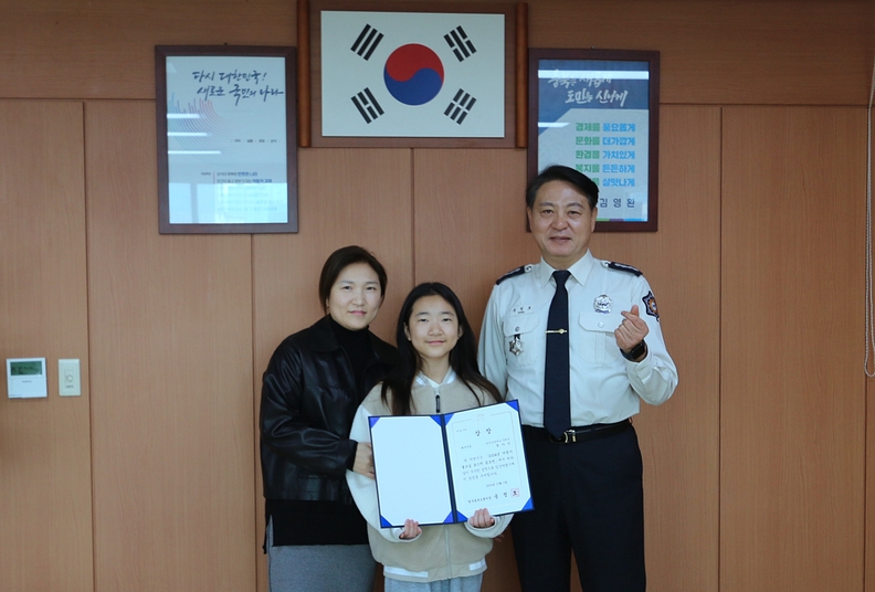 청주동부소방서가 2024년 어린이 불조심 포스터 공모전에서 뛰어난 능력을 발휘한 정아인 양에게 상장을 수여하고 기념촬영을 하고 있다.