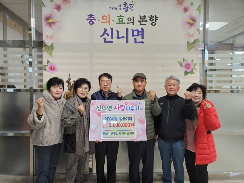 신니면 행정복지센터에서 희망나눔 캠페인이 열린 가운데 신니면 주민자치위원들이 기부를 하며 기념사진을 찍고 있다.