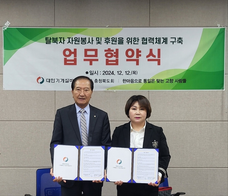 양승복(왼쪽) 회장과 강유진 대표가 지난 12일 업무협약식을 체결하고 기념촬영하고 있다.