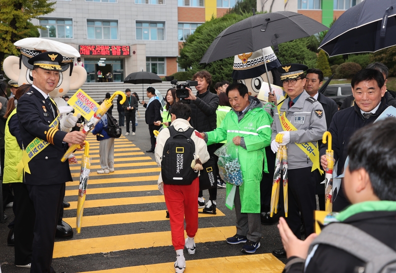 진천군이 경찰서와 함께 등굣길 안전 캠페인을 펼치고 있다.