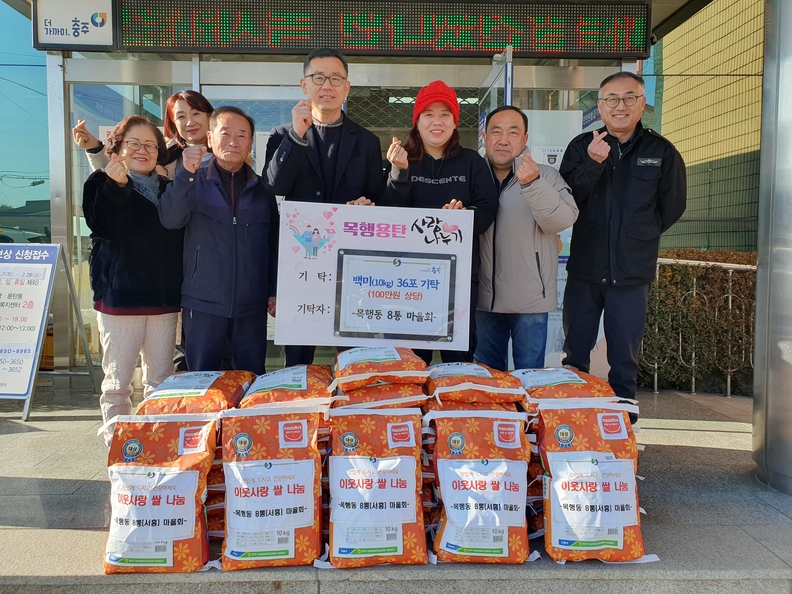 충주 목행동 8통 마을회 회원들이 취약계층에 전달할 백미 앞에서 기념사진을 찍고 있다.