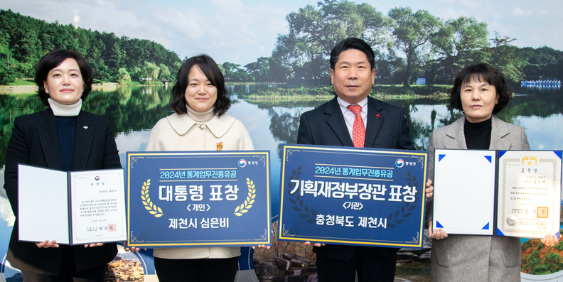 김창규 시장과 직원들이 '2024년 통계업무 진흥 유공 대통령 표창'과 '기획재정부장관 표창' 등 개인과 기관 2개 분야 수상 후 기념촬영을 하고 있다.