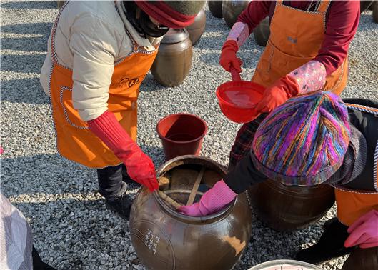 지난해 청주시농업기술센터가 진행한 장 담그기 체험행사에서 한 시민이 장의 상태를 확인하고 있다.