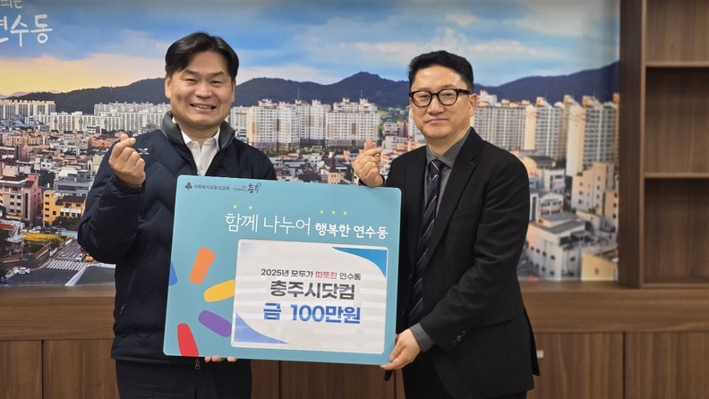 충주시닷컴 카페 관계자가 이웃돕기 성금을 연수동 행정복지센터에 기탁하고 있다.