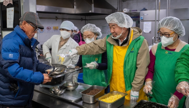 이재영(오른쪽 두번째) 증평군수가 장애인복지관에서 진행된 '사랑의 점심나눔' 행사에 참여해 배식하고 있다.