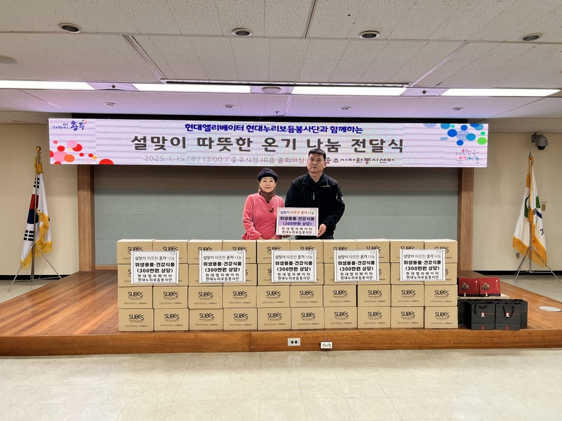 현대엘리베이터 현대누리보듬봉사단 관계자가 충주시자원봉사센터에 후원 물품을 전달하고 있다.