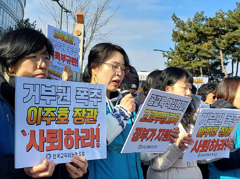 전국교직원노동조합 대전·세종·충남·충북지부가 16일 정부세종청사 교육부 앞에서 기자회견을 열어 교육부의 인공지능(AI) 디지털교과서와 고등학교 무상교육 정책을 규탄하고 있다.
