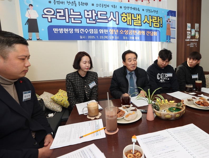 송기섭(가운데) 진천군수가 23일 청년소상공인들과 간담회를 갖고 있다.