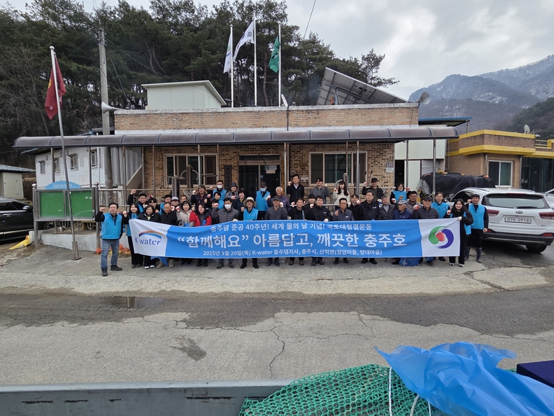 충주시와 수공 충주댐지사, 환경단체, 주민 등이 하천 정화 활동을 벌인 뒤 기념사진을 찍고 있다.