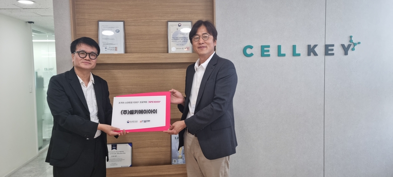 노진상(왼쪽) 충북중기청장이 이남용 (주)셀키에이아이 대표에게 '신규 초격차 스타트업' 현판을 수여하고 있다.