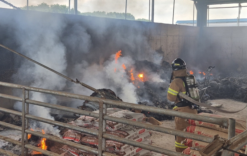 증평소방서 소방관이 5일 오전 증평군 도안면 한 축사에서 발생한 화재를 진화하고 있다.
