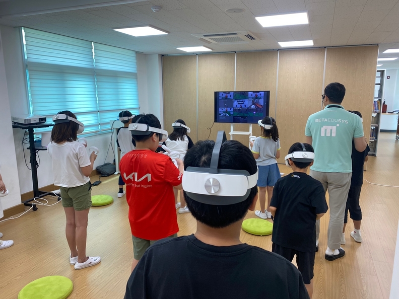 제천 송학초 3~5학년 학생들이 생존수영 VR 체험 교육으로 위기 대응 능력을 높이고 있다.
