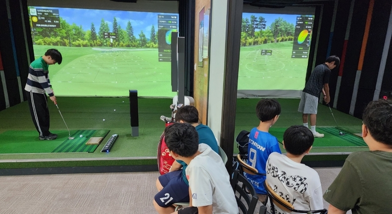 제천 금성초 3~6학년 학생들이 지역 스크린골프장을 찾아 평소 늘봄 프로그램을 통해 배운 골프 실력을 발휘하고 있다.