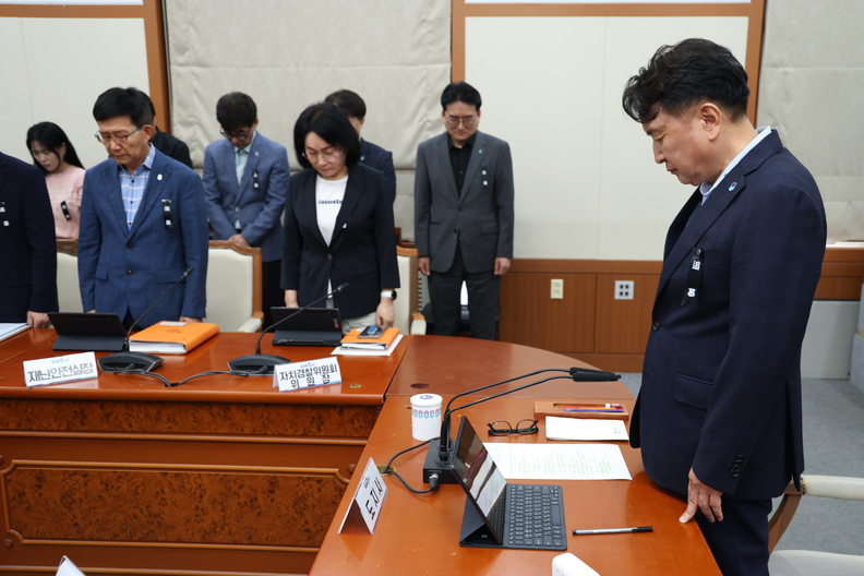 충북도는 8일 도청 소회의실에서 확대간부회의를 개최한 가운데 김영환(오른쪽) 지사와 간부 공무원들이 회의에 앞서 오송 참사 희생자들에 대한 추모 묵념을 하고 있다.