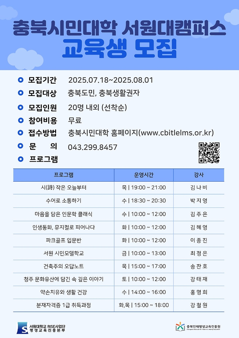 서원대가 운영하는 충북시민대학 서원대캠퍼스 교육은 충북 지역혁신중심 대학지원체계(RISE, 라이즈) 공모사업의 지원을 받아 운영된다.
