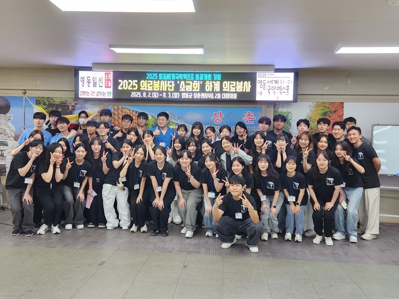 영동군 상촌면을 찾는 의료봉사단체 소금회가 주민들에게 따뜻한 의료 손길을 전하며 기념촬영을 하고 있다.