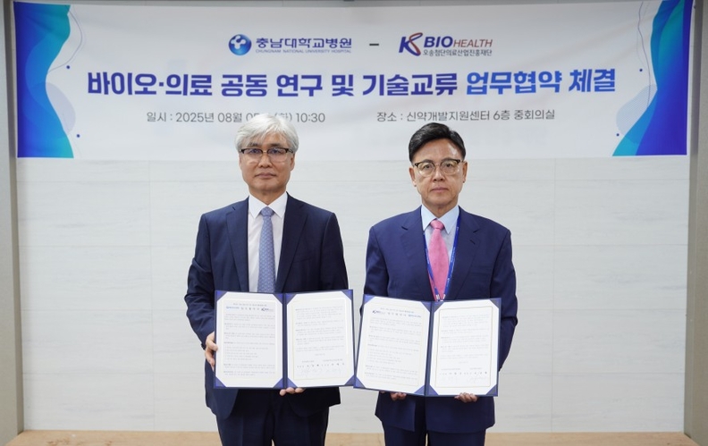 조강희(왼쪽) 충남대학교병원장, 이명수 오송첨단의료산업진흥재단 이사장이 5일 재단 신약개발지원센터 중회실에서 바이오·의료 공동 연구 및 기술교류를 위한 업무협약을 체결하고 있다.