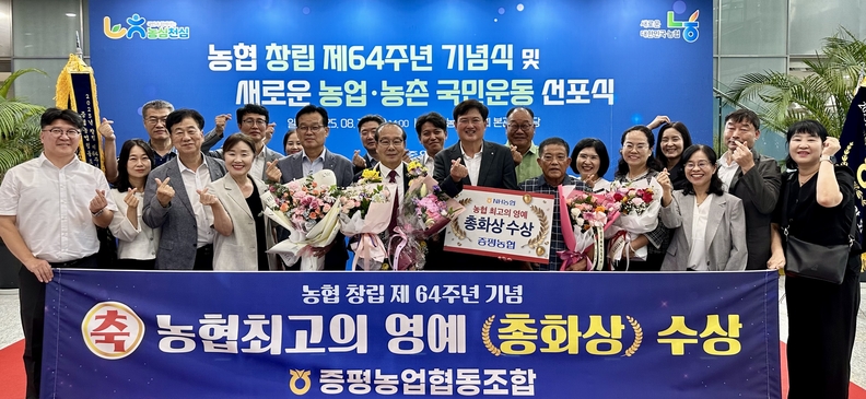 배종록(왼쪽 여섯 번째) 증평농협조합장이 지난 13일 열린 농협창립 64주년 기념식에서 '총화상'을 수상한 뒤 농협관계자들과 사진 촬영을 하고 있다.
