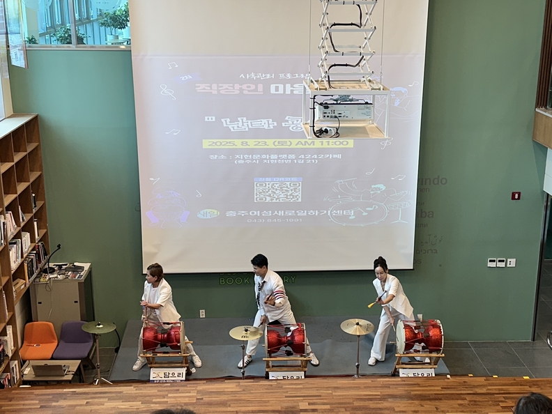 충주여성새로일하기센터 관계자들이 여성 직장인을 위한 난타 공연을 선보이고 있다.