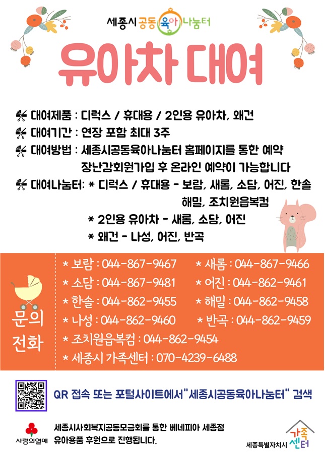 관련 문의는 세종시가족센터(070-4239-6488)나 대여나눔터로 하면 된다.