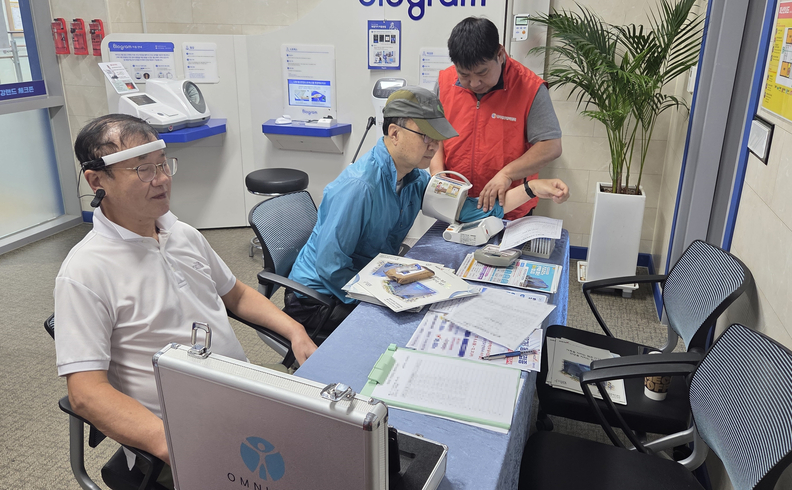 한국건강관리협회 충북·세종지부 관계자들이 9일 청주서원노인복지관에서 건강캠페인을 열고 이용자들의 건강을 확인할 수 있는 혈압·악력 등을 측정하고 있다.