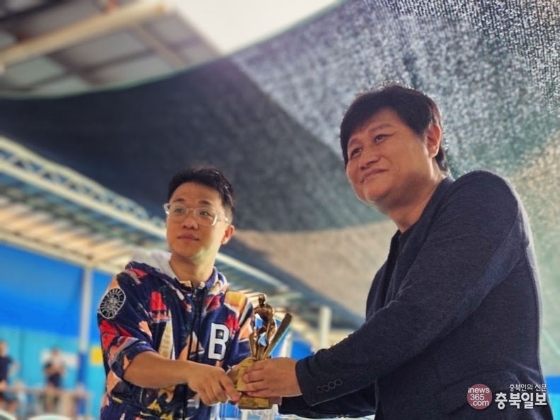 WATER 7팀의 유영진(왼쪽)씨가 '2025 충주시 생활체육수영대회' 개인 최우수상(MVP)을 건네받고 있다.