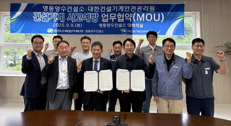 영동양수건설소와 대한건설기계안전관리원이 9일 영동양수건설소 대회의실에서 건설기계 사고 예방을 위한 업무협약을 체결한 뒤 기념촬영을 하고 있다.